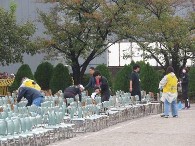 濡れてしまった椅子を先生方とボランティアの方がタオルで拭いてくれています
