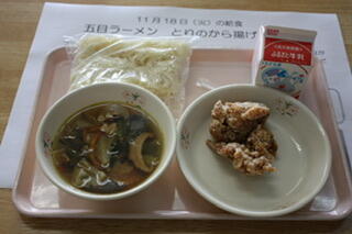 メニューは、五目ラーメン(ホット中華麺)、とりのからあげ、牛乳