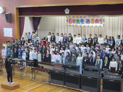 2月5日㈬に6年生を送る会がありました。 1年生から5年生までの子供たちが6年生への感謝の気持ちを込めて発表します。 6年生の入場です。 全校生徒で「seeyou」を合唱しました 3年生は、音楽会で6年生が演奏した曲をピアニカで再現♬ 「ライラック」はダンスで😆 2年生は、運動会で6年生が表現した組体操やフラッグ、応援団を再現💪 1年生は、かっこいい6年生を合言葉に6年生との関わりを表現。 シャトルランやジャンピングオリンピックで声をかけて応援してもらったこと、通学班で安全に誘導してくれたこと、仲良し班で一緒に遊んでくれたこと。 4年生は、クラブ活動で6年生に教えてもらったことや感謝の気持ちを各クラブごとに 「好き過ぎて滅!」の音楽にのせて表現。 5年生は、「いつも何度でも」を合唱し、委員会ごとに感謝の気持ちを発表。 最後に、6年生から「エール」を合唱。 「シング・シング・シング」を演奏。 6年生も堂々とした合唱と合奏をみせてくれました。 最高学年として下級生のお手本となるような「背中」を見せることができたのではないでしょうか。 みんなからの感謝の言葉で、卒業前にまた一つ大切な思い出を作ることができましたね😄