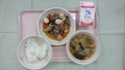 ごはん 豚肉とうずらの卵のうま煮 白菜のみそ汁 牛乳