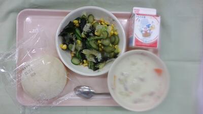 メロンパン 野菜サラダ ホワイトシチュー 牛乳