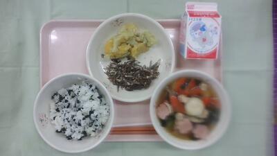 わかめごはん 田作り くりきんとん おぞうに 牛乳