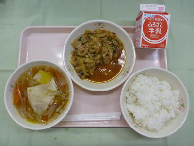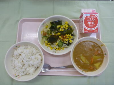 《今日の献立》 チキンカレーライス、牛乳、新玉ねぎドレッシングのサラダ