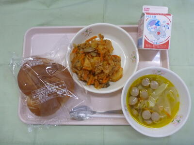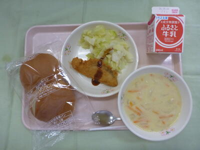 《今日の献立》 ツイストパン、牛乳、とりのから揚げ、野菜スープ